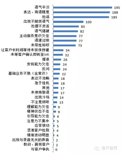 录音监听数据显示,某客服中心涉座席因素导致客户“不满意”评价排名前5的因素分别为“语气平淡”、“表达、用语随意”、“抢话”、“出现不耐烦语气”和“处理不灵活”,此5项因素涉及录音共计753通,占涉座席因素导致不满意评价录音总数的79.18%,图8显示了涉座席因素导致不满意评价的具体表现。