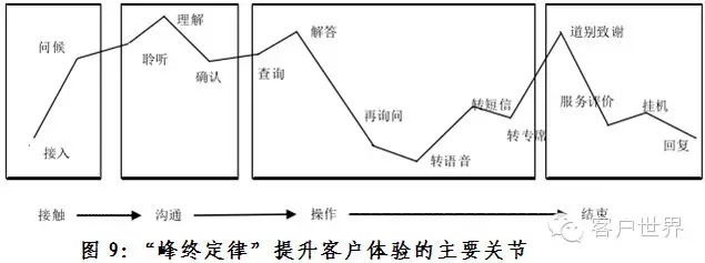 借助峰终定律来差异化管理热线服务的不同阶段,重点关注服务过程中主宰客户体验总体感受的“峰”、“终”关键时刻,重点满足客户的核心诉求,并在服务过程结尾让客户体验最高质量的服务。以下是10086经过调研后梳理出人工热线服务的关键环节。从各过程的环节客户感知评分来看,问候、理解和解答是客户体验的峰值时刻,而道别致谢是客户体验的终值时刻。